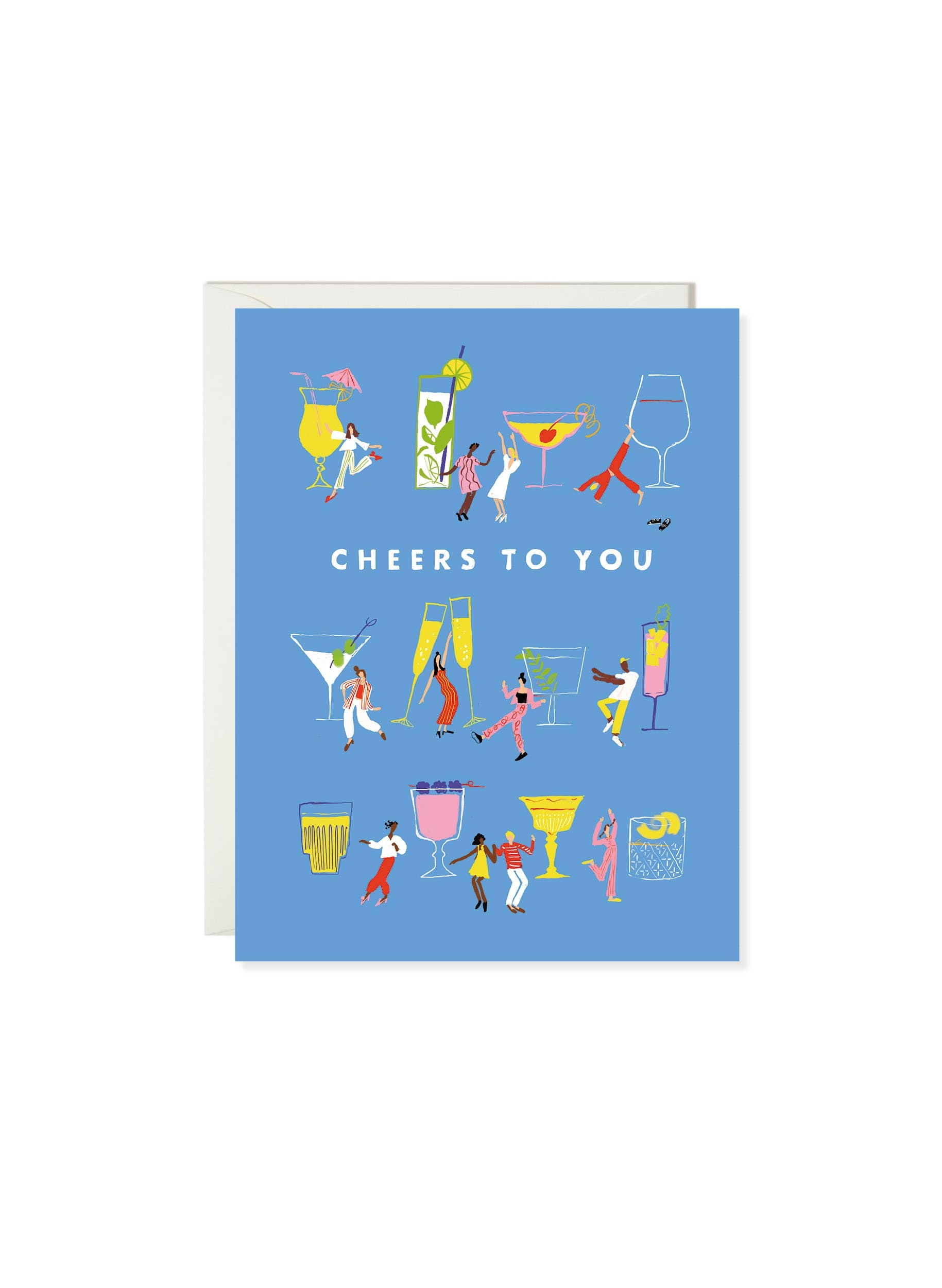 Cheers to promotions, engagements, good news, and good times! The Cocktail Congrats card is the perfect toast to life’s celebratory moments. Illustrated with an array of colorful cocktail glasses—martinis, spritzes, and more—this festive design is brought to life by tiny dancing figures partying around the drinks. The message? A big, bubbly “CHEERS TO YOU” in bold red type. This card is ideal for celebrating friends, coworkers, or anyone who deserves a moment of clinking glasses—even if it’s just metaphorical.