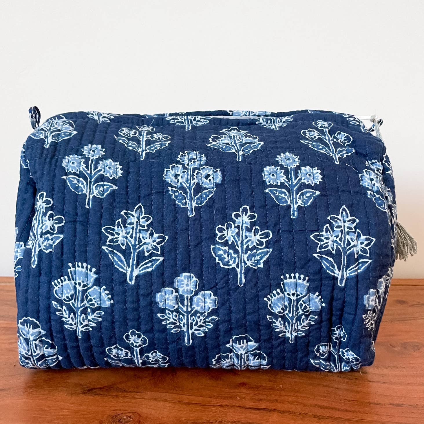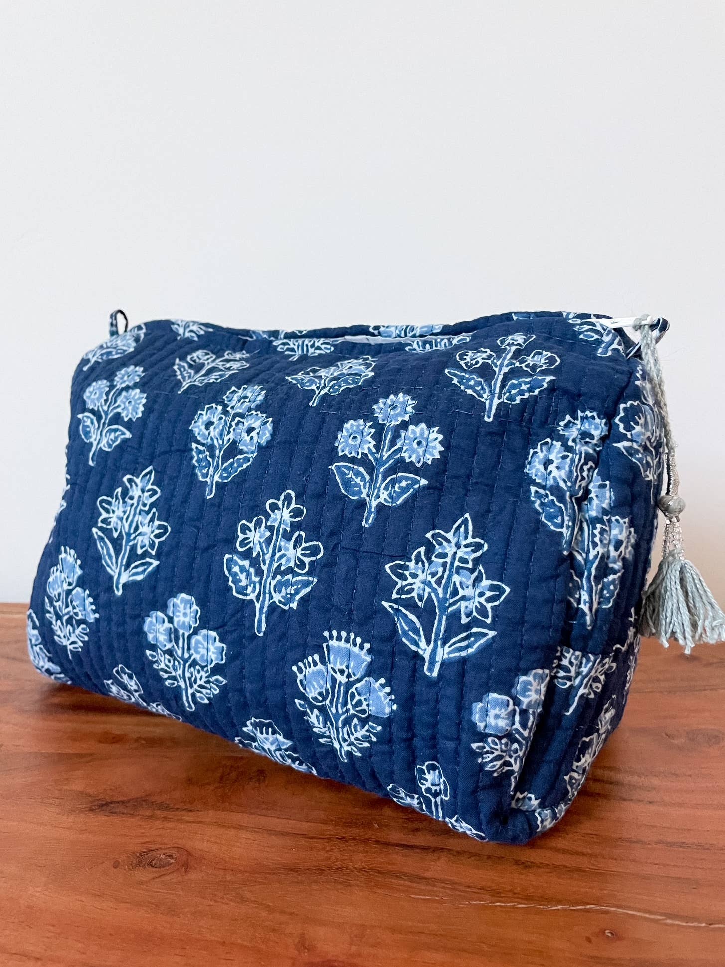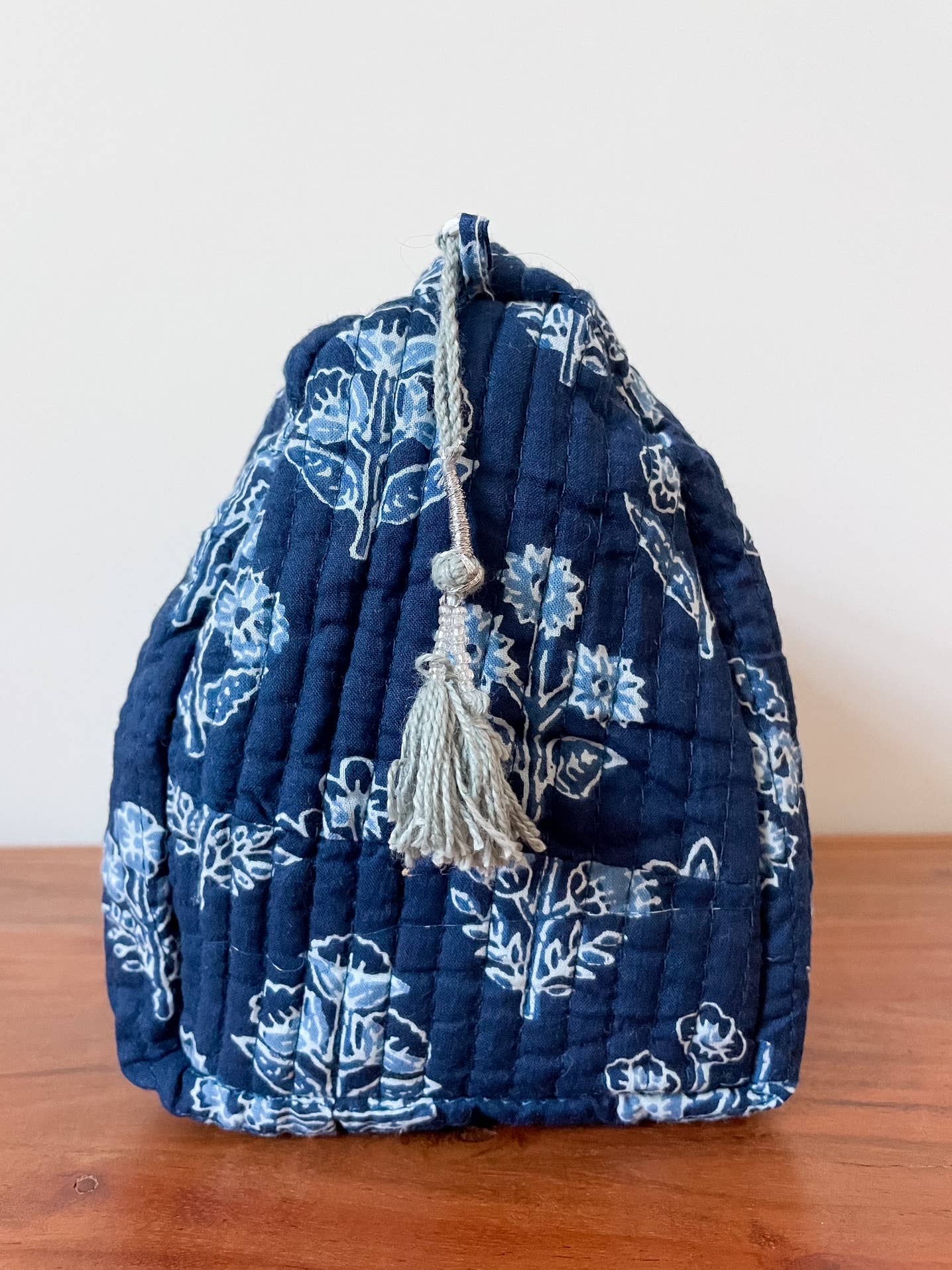 The outer layer is made up of quilted, block printed cotton fabric. Inner layer is lined with water-resistant plastic. Zipper closure with decorative tassel trim.